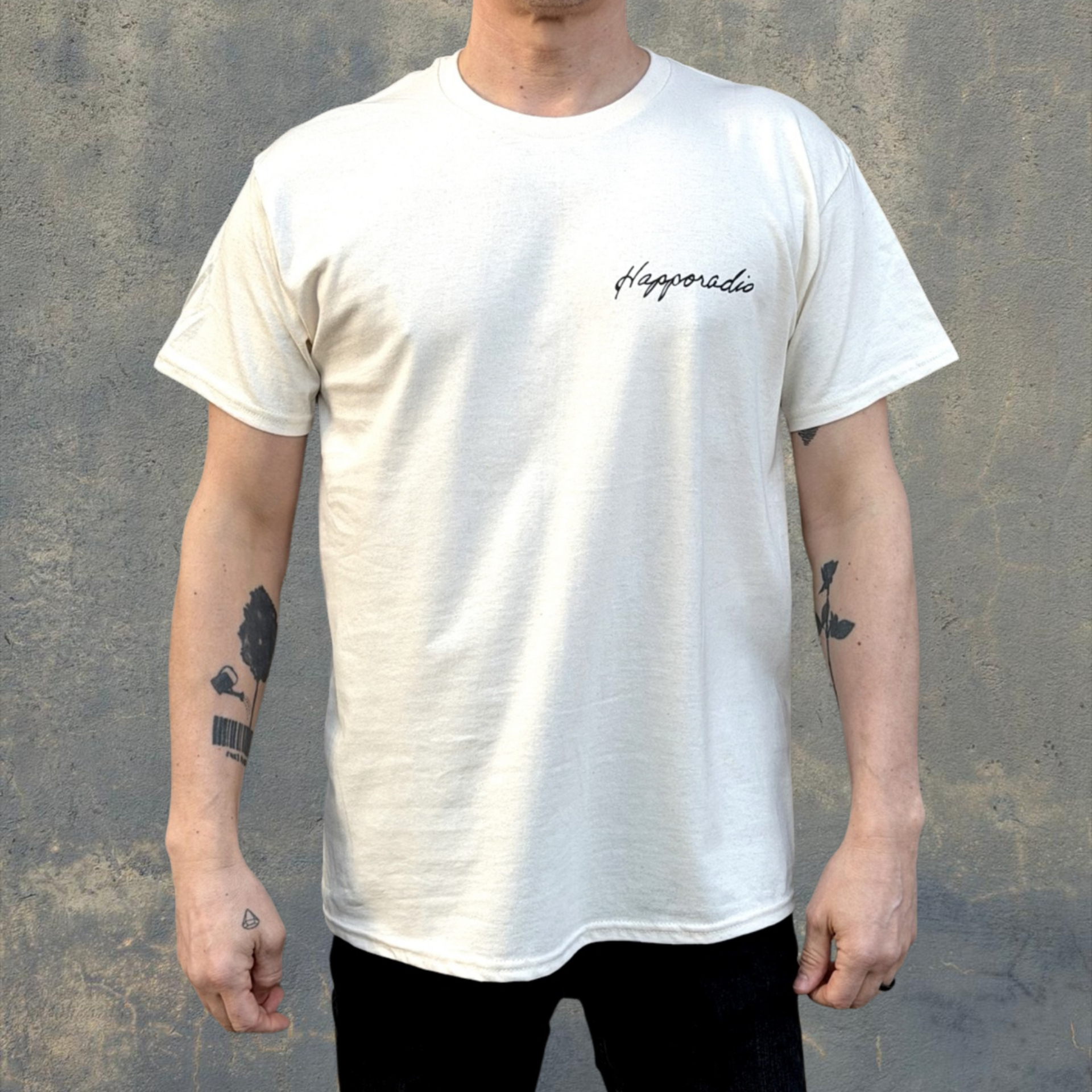 T-paita HAPPORADIO luonnonvalkoinen Pieni kaunokirjoitus