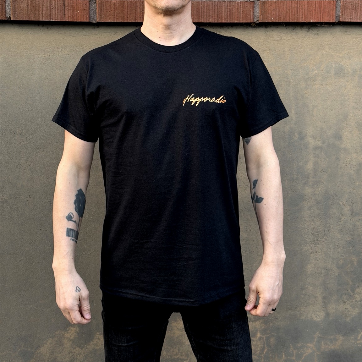 T-paita HAPPORADIO musta Pronssinen kaunokirjoitus